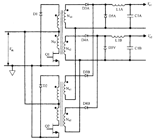 不過至今仍不很肯定 , 在輸入和負(fù)載失常的 瞬態(tài)情況下 ,推挽拓?fù)涞拇磐ú黄胶鈫栴}能否完好能處置 。沒有磁通不平衡問題可能是運(yùn)用交錯(cuò)正激變換器的最好理由 。 在較少見的直流輸出電壓超越 200V 的場所,同樣的輸出功率下 ,選用交錯(cuò)正激變換器比選用單個(gè)正激變換器更合理 。單個(gè)正激變換器輸出續(xù)流二極管( D5A 或 D5B ) 承受的反向 電壓峰值為交錯(cuò)正激變換器的兩倍 。