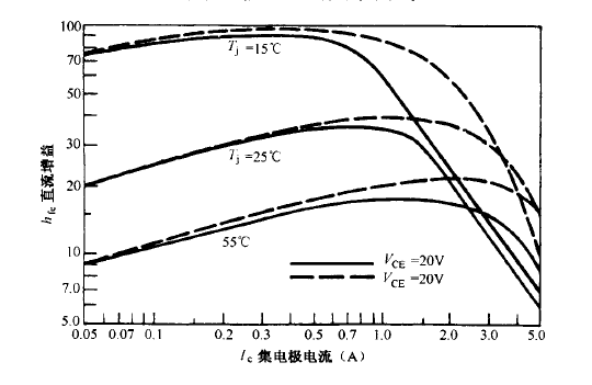圖 9.13 雙極型晶體管的直流增益曲線 。雙極型晶體管的增益隨著輸出電流的增大而減小 ,而MOSFET 管不存在這種情況 ,MOSFET 管最大電流只受結(jié)點(diǎn)溫升的限制
