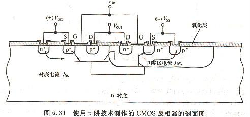 CMOS電路的阱結(jié)構(gòu)最主要的問題在于閂鎖現(xiàn)象,閂鎖是由阱結(jié)構(gòu)中寄生的pn—p-n二極管作用所造成的,如圖6.3】所示,寄生的p—n-I,一n二極管是由一橫向的p-n-p及一縱向的n-p-n雙極型晶體管所組成的.p溝道MOSFFT的源極、n襯底及p阱分別為橫向p-n-p雙極型晶體管的發(fā)射極、基極及集電極;n溝道MOSFET的源極、p阱及n襯底分別為縱向n-p-n雙極型晶體管的發(fā)射極、基極及集極其寄生部分的等效電路如圖6.32所示.凡及Rw分別為襯底及阱中的串聯(lián)電阻.每一晶體管的基極是由另一晶體管的集電極所MOS管驅(qū)動,并形成一正反饋回路,其架構(gòu)就如第5章中所討論的可控硅器件( thyristor).閂鎖發(fā)生于兩個雙極型晶體管的共射電流增益乘積大于l時.當(dāng)發(fā)生閂鎖時'一大電流將由電源供應(yīng)處(Vpo)流向接地端,導(dǎo)致一般正常電路工作中斷,甚至?xí)捎诟唠娏魃岬膯栴}.而損壞芯片本身.