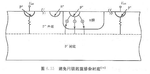 為避免發(fā)生閂鎖效應(yīng),必須減少寄生雙極型晶體管的電流增益,一種方法是使用金摻雜或中子輻射,以降低少數(shù)載流子的壽命,但此方法不易控制且也會導(dǎo)致漏電流的增加.深阱結(jié)構(gòu)或高能量注入以形成倒退阱( retrograde well),可以提升基極雜質(zhì)濃度,因而降低縱向雙極型晶體管的電流增益.在倒退阱結(jié)構(gòu)中,阱摻雜濃度的峰值位于遠(yuǎn)離表面的襯底中.另一種減少閂鎖效應(yīng)的方法,是將器件制作于高摻雜襯底上的低摻雜外延層中,如圖6. 33所示.高摻雜襯底提供一個收集電流的高傳導(dǎo)路徑,這些電流隨后會由表面接點(diǎn)流出.