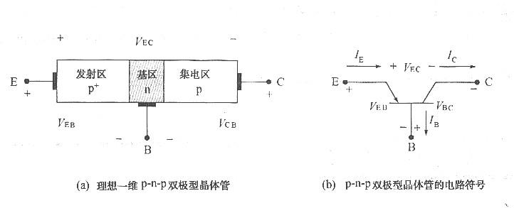 圖5.2(a)為理想的一維結(jié)構(gòu)p-n-p雙極型晶體管,具有二段不同摻雜濃度的區(qū)域,形成兩個p-n結(jié),濃度最高的p+區(qū)域稱為發(fā)射區(qū)(在圖5.2中以E定義);中間較窄的n型區(qū)域,其雜質(zhì)濃度中等,稱為基區(qū)(base,定義為B),基區(qū)的寬度需遠小于少數(shù)載流子的擴