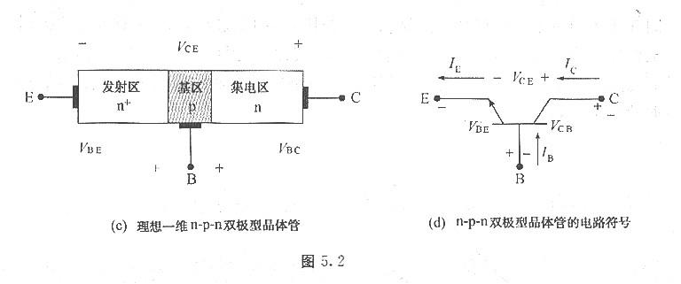n-p-n雙極型晶體管的結(jié)構(gòu)與p-n-p雙極型晶體管是互補的,圖5.2(c)與圖5.2(d)分別是理想p-n-p晶體管的結(jié)構(gòu)與電路符號。將p-n-p雙極型晶體管結(jié)構(gòu)中的p換成n、n換成p,即為n- p-n雙極型晶體管的結(jié)構(gòu),因此電流方向與電壓極性也都相反.在下一小節(jié)中,我們將仔細討論p-n-p雙極型晶體管,因為其少數(shù)載流子(空穴)的流動方向與電流方向相同,可更直觀地了解電荷運動的機制,只要了解了p- n-p晶體管,我們只要將極性和摻雜類型調(diào)換,即可描述n-p-n晶體管