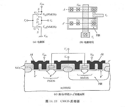 圖14. 23(b)為CMOS反相器的規(guī)劃.圖14.23(c)則為沿著A-A,的器件截面圖,在這個(gè)工藝中,先在n型襯底上停止p型注入摻雜而構(gòu)成一個(gè)P型阱(或p型槽).p型摻雜濃度必需足夠高才干過度補(bǔ)償(overcompensate)n型襯底的背景濃度(backgrounddoping).關(guān)于p型阱的n溝道MOSFET,工藝則與前面所提過的相同,關(guān)于p溝道MOSFET而言,注入B、或(BF2)、離子至n型襯底構(gòu)成源極與漏極,而As+離子則可用于溝道離子注入來調(diào)整閾值電壓及在p溝道器件左近的場(chǎng)氧化層下構(gòu)成n+溝道阻斷,由于制造p溝道MOS-FET需求p阱和其他的步驟,所以制造CMOS電路的工藝步驟數(shù)是NMOS電路的兩倍,因而,我們?cè)诠に噺?fù)雜性與降低功率耗費(fèi)間需有所取舍,