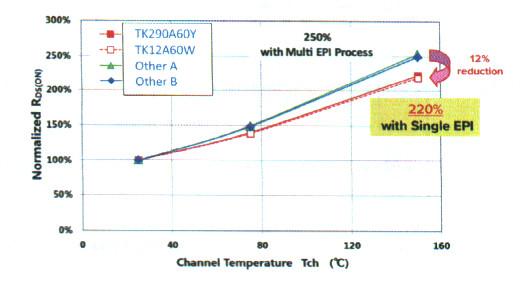 單外延工藝也使超級結(jié)MOSFET對溫度變化時有著更穩(wěn)定的性能,這有助于在更高工作溫度時維持功率變換器的效率。圖3說明了采用最新一代技術(shù)使器件標(biāo)稱導(dǎo)通電阻在溫度變化顯著時減少,在150℃時導(dǎo)通電阻降低了12%。