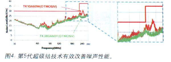 這種器件產(chǎn)生的噪聲可與其他與之競爭的低EMI器件相媲美,同時該器件具有超級結(jié)技術(shù)的優(yōu)越導(dǎo)通電阻特性。圖4中比較了用于電視機電源中的PFC電路的第4代和第5代N溝道o.38m.Ω級600V器件產(chǎn)生的EMI.從結(jié)果看出新技術(shù)的采用顯著降低了干擾。