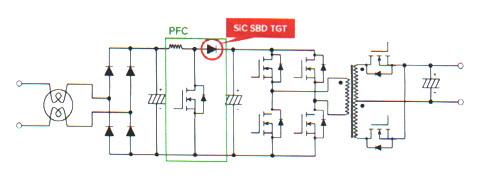 圖5:最新SiC=極管與高速超級結(jié)MOSFET結(jié)合使用可提高PFC電路的效率。