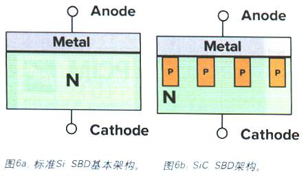 圖6a和6b給出了結(jié)構(gòu)改進后的SiC SBD與標(biāo)準(zhǔn)Si SBD的結(jié)構(gòu)對比。