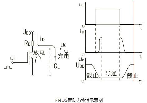 MOS管在導(dǎo)通與截止兩種狀態(tài)發(fā)作轉(zhuǎn)換時同樣存在過渡過程,但其動態(tài)特性主要取決于與電路有關(guān)的雜散電容充、放電所需的時間,而管子自身導(dǎo)通和截止時電荷積聚和消散的時間是很小的。下圖 (a)和(b)分別給出了一個NMOS管組成的電路及其動態(tài)特性表示圖。