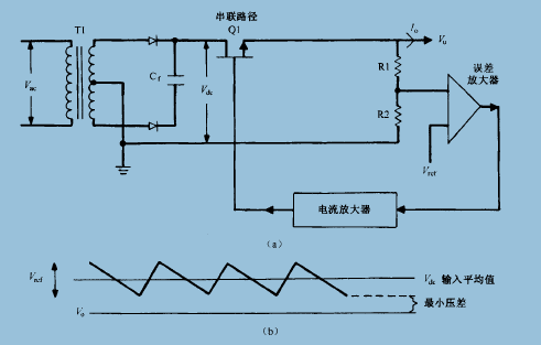 實(shí)質(zhì)上,輸入電壓的任何變化(不管是由于交流輸入網(wǎng)壓的紋波,還是由于輸入電壓規(guī)定范圍內(nèi)的穩(wěn)態(tài)波動,或是由于負(fù)載瞬變造成的輸入電壓瞬態(tài)變化)都會被串聯(lián)晶體管等效電阻所調(diào)整.使輸出電壓保持不變暗,其恒定程度與反饋放大器的的開環(huán)增益相關(guān)