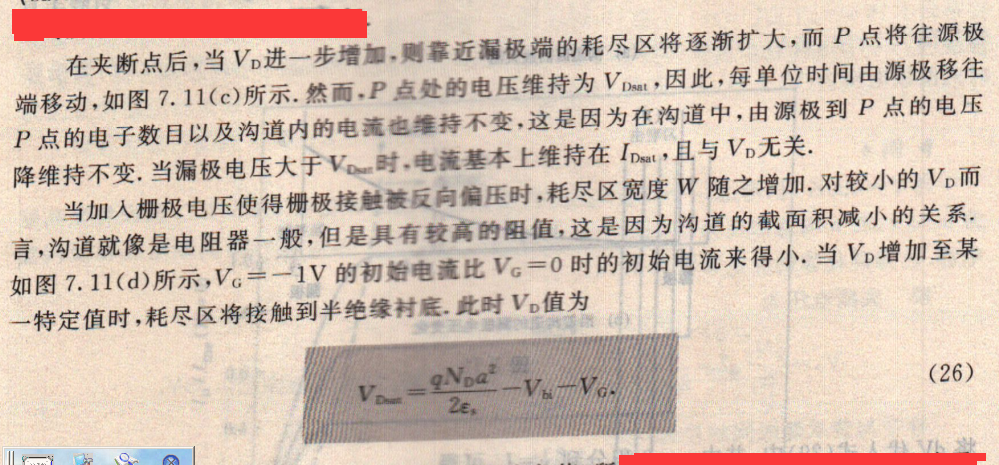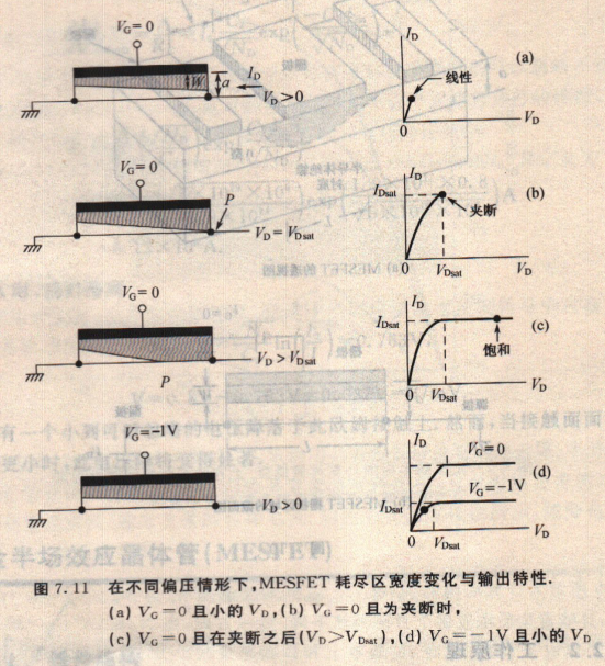 隨營漏極電壓的持續(xù)增加,最終將使得耗盡區(qū)接觸到半絕緣襯底,如圖7.ll(b)所示.此現(xiàn)象的發(fā)生是當(dāng)漏傲9Vd有W=a.由式(7),令V=-VDsat,可以求出相對應(yīng)的漏極電壓值,稱為飽和電壓(sat uration voltage)VDsat: