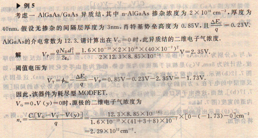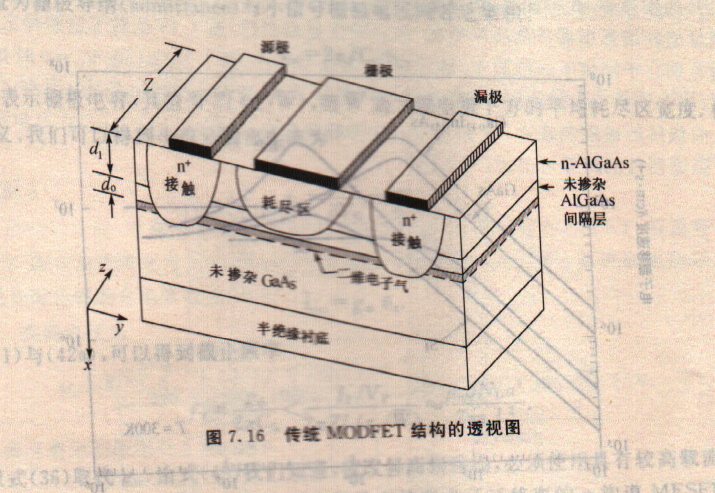 圖7,1、6為傳統(tǒng)MODFET的透視圖.MODFET的特征是柵極下方的異質(zhì)結(jié)結(jié)構(gòu)以及調(diào)制摻雜層,對于圖7:.16中的器件來說.AIGaAs為一寬禁帶半導體,而GaAs則為窄禁帶半導體.這兩種半導體是被調(diào)制摻雜的,也就是說,除了在極窄的區(qū)域如中并無摻雜外