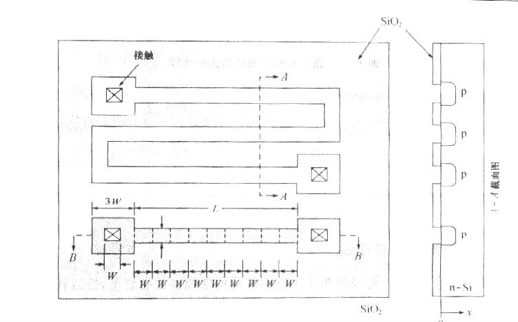 為了構(gòu)成集成電路電阻,可以淀積一層具有阻值的薄膜在硅襯底上,然后運(yùn)用圖形曝光技術(shù)和刻蝕定出其圖樣,也可以在生長于硅襯底上的熱氧化層上開窗,然后寫入(或是渙散)相反導(dǎo)電型雜質(zhì)到晶片內(nèi),圖14.3閃現(xiàn)運(yùn)用后者方法構(gòu)成的兩個(gè)電阻的頂視圖和截面圖,一個(gè)是曲折型,另一個(gè)是直條型.