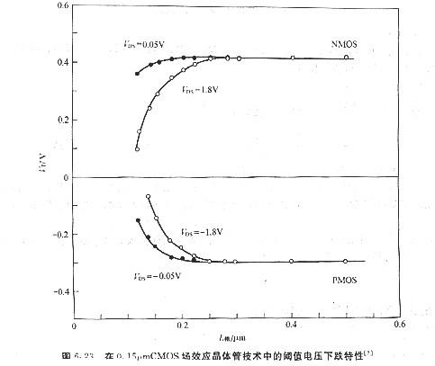 6.3.1 短溝道效應(yīng)(short-channel effect)式(45)中的閾值電壓是基于6.2,l節(jié)中的突變溝道近似推導(dǎo)得出的,也即襯底耗盡區(qū)內(nèi)的電荷僅由柵極電壓產(chǎn)生的電場(chǎng)所感應(yīng)出.換言之,式(45)中的第三項(xiàng)與源極到漏極間的橫向電場(chǎng)無關(guān).但是隨著溝道長(zhǎng)度的縮減,源極與漏極問的電場(chǎng)將會(huì)影響電荷散布、閾值電壓控制以及器件漏電等器件特性,