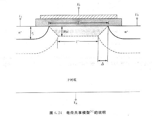 當(dāng)溝道的邊緣效應(yīng)變得不可疏忽時(shí),隨著溝道的縮減,n溝道MOSFET的閾值電壓通常會(huì)變得不像原先那么正,而關(guān)于p溝道MOSFET而言,則不像原先那么負(fù),圖6.23顯現(xiàn)了在VDS=o.05V時(shí)VT下跌的現(xiàn)象.閾值電壓F跌可用如圖6.24所示的電荷共享(chargesharing)模型來加以解釋,此圖為一個(gè)n溝道MOSFET的剖面圖,且器件工作在線性區(qū)(VDs≤o.1V),因而漏極結(jié)的耗盡區(qū)寬度簡(jiǎn)直與源極結(jié)相同.由于溝道的耗盡區(qū)與源極和漏極的耗盡區(qū)堆疊,由柵極偏壓產(chǎn)生的電場(chǎng)所感應(yīng)生成的電荷可用這梯形區(qū)域來近似同等.