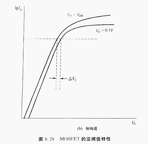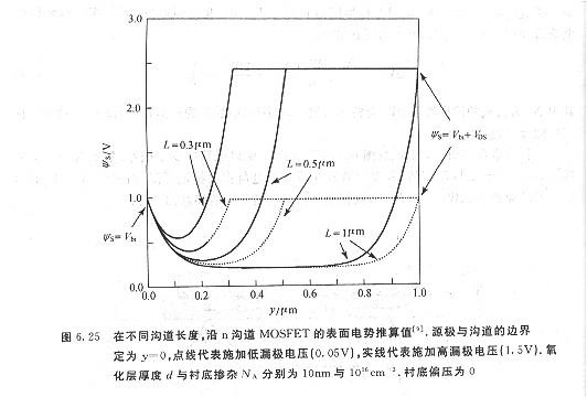 當(dāng)短溝道MOSFET的漏極電壓由線性區(qū)增至飽和區(qū)時(shí),其閾值電壓下跌將更嚴(yán)重(如圖6.23所示).此效應(yīng)稱為舞場(chǎng)感應(yīng)勢(shì)壘降落.?dāng)?shù)個(gè)不同溝道長(zhǎng)度的n溝道器件的源極與漏極間的外表電勢(shì)如圖6.25所示,點(diǎn)線為VDS=o,實(shí)線為VDS>o.當(dāng)柵極電壓小于VT時(shí),p—型硅襯底在n+源極與漏極問構(gòu)成一勢(shì)壘,并限制電子流由源極流向漏極.對(duì)工作在飽和區(qū)的器件而言,漏極結(jié)的耗盡區(qū)寬度遠(yuǎn)大于源極結(jié),在長(zhǎng)溝道的例子中,增加漏極結(jié)耗盡區(qū)寬度并不會(huì)影響勢(shì)壘高度(參閱圖6.25中l(wèi)μm的例子).但當(dāng)溝道長(zhǎng)度足夠短時(shí),漏極電壓的增加將減小勢(shì)壘高度(圖6.25中o.3μm與o.5μm的例子),此歸因于漏極與源極太接近所形成的外表區(qū)的電場(chǎng)浸透,此勢(shì)牟降低效應(yīng)會(huì)招致電子由源極注入漏極,形成亞閾值電流的增加.因而在短溝道器件中,閡值電壓會(huì)隨漏極電壓增加而降低.