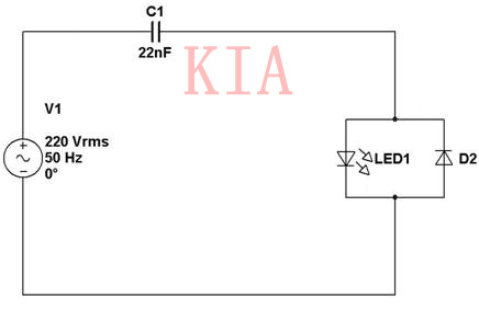 在上述簡(jiǎn)單的指示燈電路用在220V交流中,由于LED的反向擊穿電壓一般只有幾伏,因此在交流電壓的負(fù)半周,LED處于反向擊穿狀態(tài),