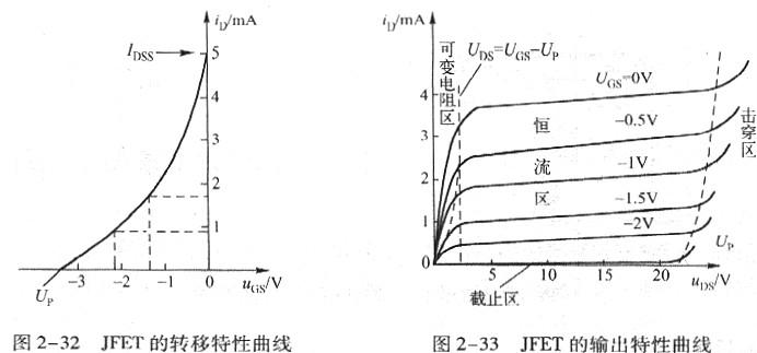 式中,IDSS為飽和電流,表示UGS=o時的iD值;UP為夾斷電壓,表示UGS=Up時iD為零。