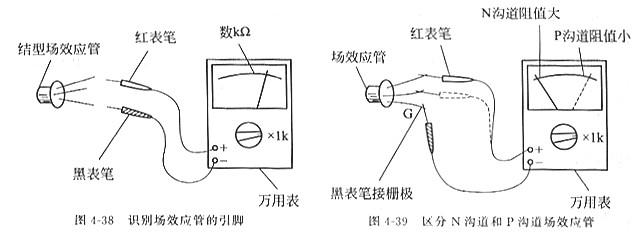 如圖4-39所示,將萬用表置于“RX1k”擋,黑表筆接?xùn)艠OG.紅表筆分別接另外兩引腳,假如測得兩個(gè)電阻值均很大,則為N溝道場效應(yīng)管。假如測得兩個(gè)電阻值均很小,則為P溝道場效應(yīng)管。假如丈量結(jié)果不契合以上兩步,則闡明該場效應(yīng)管已壞或性能不良。