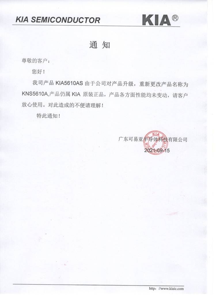 關(guān)于KIA產(chǎn)品絲印-KIA5610AS變更通知函