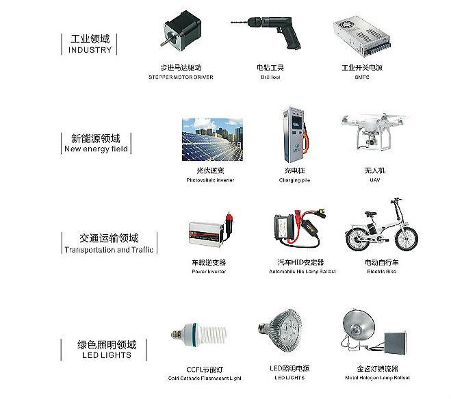 在移動數(shù)碼,LCE,HID,LED,電動車,開關(guān)電源,逆變器,節(jié)能燈等領(lǐng)域深得客戶認(rèn)可。