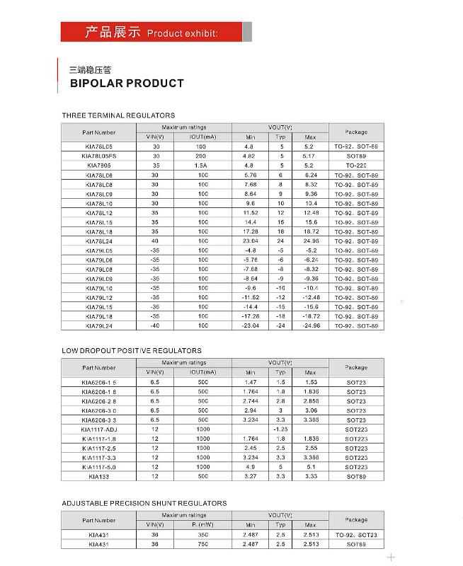 KIA半導(dǎo)體專業(yè)生產(chǎn)MOS管場效應(yīng)管廠家(國家高新技術(shù)企業(yè))成立于2005年,公司成立初期就明確立足本市場,研發(fā)為先導(dǎo),了解客戶需求,運用創(chuàng)新的集成電路設(shè)計方案和國際同步研發(fā)技術(shù),結(jié)合中國市場的特點,向市場推出了BIPOLAR,CMOS,MOSSFET等電源相關(guān)產(chǎn)品,產(chǎn)品的穩(wěn)定性,高性價比,良好的服務(wù),以及和客戶充分的技術(shù),市場溝通的嚴(yán)謹(jǐn)態(tài)度.
