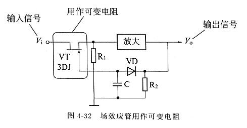 場(chǎng)效應(yīng)管可以用作可變電阻。如圖4-32所示為自動(dòng)電平控制電路,當(dāng)輸入信號(hào)Ui增大導(dǎo)致u。增大時(shí),由Uo經(jīng)二極管VD負(fù)向整流后形成的柵極偏壓一UG的絕對(duì)值也增大,使場(chǎng)效應(yīng)管VT的等效電阻增大,Ri與其的分壓比減小,使進(jìn)入放大器的信號(hào)電壓減小,最終使Uo保持基本不變。
