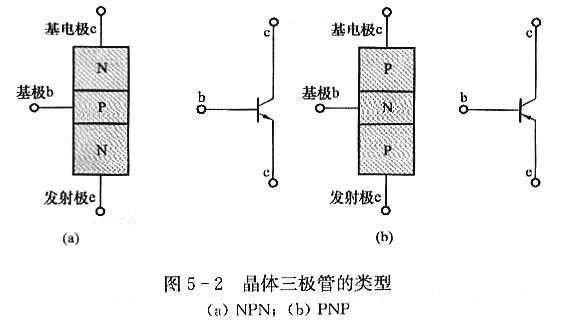 晶體三極管是一種具有兩個(gè)PN結(jié)(集電結(jié)、發(fā)射結(jié))、三個(gè)電極(發(fā)射極、基極、集電極)、三個(gè)區(qū)(發(fā)射區(qū)、基區(qū)、集電區(qū))的半導(dǎo)體器件。按所用半導(dǎo)體材料的不同可分為鍺管和硅管;按截止頻率可分為超高頻管、高頻管(≥3MHz)和低頻管(<3MHz);按耗散功率可分為小功率管(<1W)和大功率管(≥1W);按用途可分為低頻放大管、高頻放大管、開關(guān)管、低噪聲管、高反壓管、復(fù)合管等,按PN結(jié)的構(gòu)成不同有NPN、PNP兩種類型,如圖5-2所示。