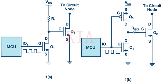 為了解決此問題,pMOSFET Q3可以作為上拉器件,其以與Q1互補的方式工作,如圖1b所示。PMOS具有較低導(dǎo)通電阻和非常高的關(guān)斷電阻,驅(qū)動電路中的功耗大大降低。為在柵極轉(zhuǎn)換期間控制邊沿速率,Q1 的漏極和Q2的柵極之間外加一個小電阻。