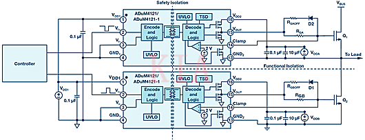 如果驅(qū)動電路沒有用于接地參考的隔離,則將需要大于VBUS 的電壓來驅(qū)動Q1。這是一個繁瑣的解決方案,對于高效系統(tǒng)來說并不實用。因此,人們需要經(jīng)過電平轉(zhuǎn)換并以高端晶體管源極為基準的控制信號。這被稱為功能隔離,可以利用隔離式柵極驅(qū)動器(如ADuM4223)來實現(xiàn)。