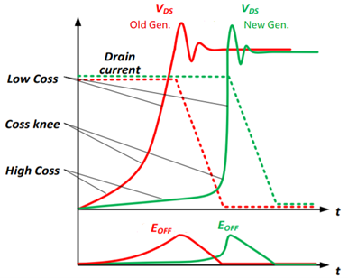 隨著制程技術(shù)演進(jìn),Coss變化曲線變壓更為急劇,這在新老代的MOSFET可明顯比較出性能差異。如下圖右為比較新老代MOSFET的Coss特性與開(kāi)關(guān)損耗的差異。