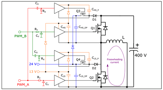 另外還需要兩個(gè)電壓源來(lái)驅(qū)動(dòng)半橋和低壓MOSFET(13V)以及MOSFET漏-源端電壓(24V)。 此外,驅(qū)動(dòng)器輸入端包含的Rx-Cx和Ry-Cy濾波器為PWM信號(hào)設(shè)定正確的時(shí)序,不需額外的控制信號(hào)。