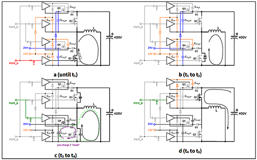 建議的預(yù)充電解決方案需要為半橋中的每個(gè)功率開(kāi)關(guān)器件配備額外的器件:高壓肖特基二極管(圖中的D1和D2)和一個(gè)低壓的MOSFET(圖中的Q3和Q4)。
