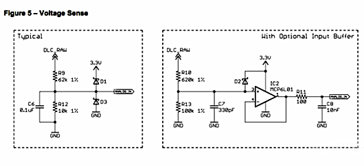 當(dāng)電壓采樣速率低和要求低時(shí),左邊電路圖即可滿足;當(dāng)采樣速率和精度要求比較高時(shí),采用右邊電路。