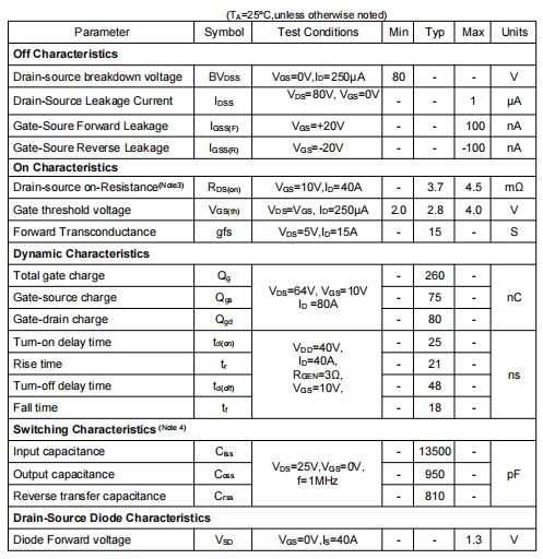 VDS=80V,ID=190A RDS(開(kāi)啟)(典型值)=3.7mΩ@VGS=10V
