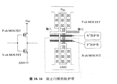 CMOS中,由于閂鎖現(xiàn)象/可控硅現(xiàn)象的緣由,需求思索設(shè)置恰當?shù)膭e離寄生雙極晶體管的稱為防護帶(圖10. 16)的別離墻/過渡電流吸收帶。不過對集成度的影響不大。最近,還開發(fā)出不需求防護帶的制造技術(shù)。而且,由于CMOS的低功耗特性,在發(fā)熱問題上比雙極器件優(yōu)越,也有利于集成化。
