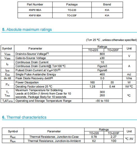 6180參數(shù)800V 10A場效應(yīng)管 高電壓MOS管-KIA MOS管