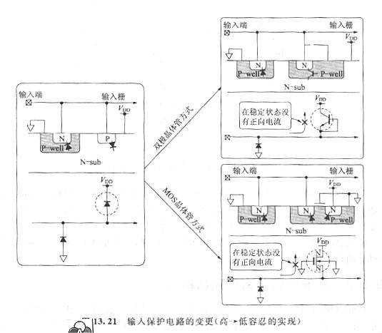 如圖13. 21所示,用晶體管的擊穿特性交流二極管的正向特性,去掉從輸入到VDD線的電流途徑。作為維護電路,也能夠吸收比VDD線的電壓電平更高的正的外來浪涌。當然,這個擊穿電壓應(yīng)該設(shè)計得比IC內(nèi)部的初級輸入柵耐壓低。
