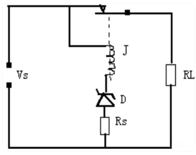 1、浪涌保護(hù)電路:穩(wěn)壓管在準(zhǔn)確的電壓下?lián)舸?,這就使得它可作為限制或保護(hù)之元件來(lái)使用,因?yàn)楦鞣N電壓的穩(wěn)壓二極管都可以得到,故對(duì)于這種應(yīng)用特別適宜。穩(wěn)壓二極管D是作為過(guò)壓保護(hù)器件。只要電源電壓VS超過(guò)二極管的穩(wěn)壓值D就導(dǎo)通,使繼電器J吸合負(fù)載RL就與電源分開(kāi)。