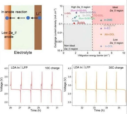 新研究表明,銦作為電池陽(yáng)極擁有兩個(gè)關(guān)鍵特性:極低的遷移能量勢(shì)壘,使離子能在固態(tài)中快速擴(kuò)散;減少與陽(yáng)極中離子的交換電流密度,減緩表面反應(yīng)——這兩大特性結(jié)合,對(duì)于快速充電和長(zhǎng)時(shí)間儲(chǔ)存電能至關(guān)重要。