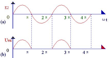 變壓器次級電壓e2 ,是一個(gè)方向和大小都隨時(shí)間變化的正弦波電壓,它的波形如圖2(a)所示。在0~K時(shí)間內(nèi),e2 為正半周即變壓器上端為正下端為負(fù)。此時(shí)二極管承受正向電壓面導(dǎo)通,e2 通過它加在負(fù)載電阻Rfz上,在π~2π 時(shí)間內(nèi),e2 為負(fù)半周,變壓器次級下端為正,上端為負(fù)。這時(shí)D 承受反向電壓,不導(dǎo)通,Rfz,上無電壓。在π~2π 時(shí)間內(nèi),重復(fù)0~π 時(shí)間的過程,而在3π~4π時(shí)間內(nèi),又重復(fù)π~2π 時(shí)間的過程…這樣反復(fù)下去,交流電的負(fù)半周就被"削"掉了,只有正半周通過Rfz,在Rfz上獲得了一個(gè)單一右向(上正下負(fù))的電壓,如圖2(b)所示,達(dá)到了整流的目的。但是負(fù)載電壓Usc 以及負(fù)載電流的大小還隨時(shí)間而變化,因此通常稱它為脈動(dòng)直流。