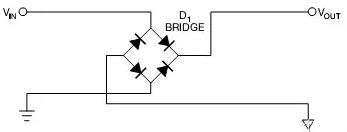 圖2 是一個(gè)橋式整流器,不論什么極性都可以正常作業(yè),但是有兩個(gè)二極管導(dǎo)通,功耗是圖1的兩倍