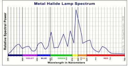 圖示出在385nm,422nm,497nm,540nm處,564nm,583nm(最高),630nm的,和674nm峰值的典型的金鹵燈的輸出光譜。