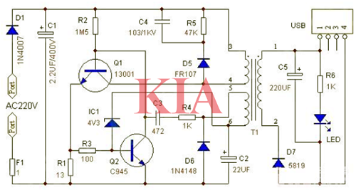 5v充電器電路圖,開關(guān)電源電路-KIA MOS管