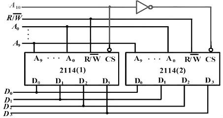 例: 用2片2114(1024×4bit)RAM構(gòu)成2048×4bit的RAM