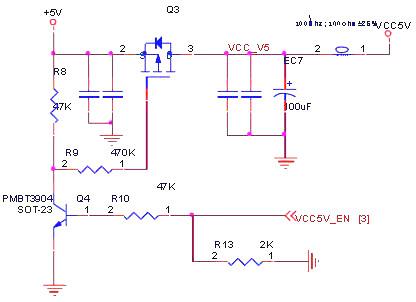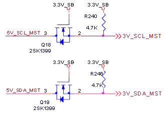 此電路是應(yīng)用于開關(guān)時序的,當(dāng)3.3V_SB為低電平時Q18、Q19不導(dǎo)通,5V時鐘數(shù)據(jù)轉(zhuǎn)3.3V時鐘數(shù)據(jù)不導(dǎo)通;當(dāng)3.3V_SB為高電平時5V時鐘數(shù)據(jù)轉(zhuǎn)3.3V時鐘數(shù)據(jù)。