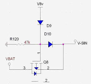 第一種應(yīng)用,由PMOS來進行電壓的選擇,當(dāng)V8V存在時,此時電壓全部由V8V提供,將PMOS關(guān)閉,VBAT不提供電壓給VSIN,而當(dāng)V8V為低時,VSIN由8V供電。注意R120的接地,該電阻能將柵極電壓穩(wěn)定地拉低,確保PMOS的正常開啟,這也是前文所描述的柵極高阻抗所帶來的狀態(tài)隱患。D9和D10的作用在于防止電壓的倒灌。D9可以省略。這里要注意到實際上該電路的DS接反,這樣由附生二極管導(dǎo)通導(dǎo)致了開關(guān)管的功能不能達(dá)到,實際應(yīng)用要注意。