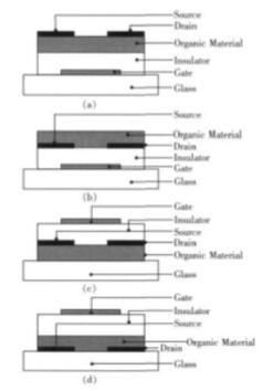 圖1(c),(d)為頂柵結(jié)構(gòu),即首先在襯底上制作有機(jī)半導(dǎo)體層,然后制作源、漏電極,隨后再制作絕緣層,最后在絕緣層上面制作柵極。這兩種柵極位于最頂部的頂柵結(jié)構(gòu)在文獻(xiàn)報(bào)道中并不是很多。
