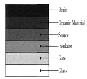 圖2是垂直溝道OFET結(jié)構(gòu),是以縮短溝道長(zhǎng)度為目的的一類新型場(chǎng)效應(yīng)晶體管。它以半導(dǎo)體層為溝道長(zhǎng)度,依次蒸鍍漏-源-珊電極,通過(guò)改變柵電壓來(lái)控制源、漏電極的電流變化。