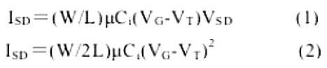 其中,Vr是閾值電壓,Ci是絕緣層單位面積的電容,u是載流子遷移率。當(dāng)Va大于閾值電壓且固定在某-一數(shù)值時(shí),Vsp很?。▅Vspl《|VG-VT),此時(shí),導(dǎo)電溝道中的電荷密度是線性減少,有機(jī)場(chǎng)效應(yīng)晶體管處于線性工作區(qū),漏電流可以通過(guò)方程式