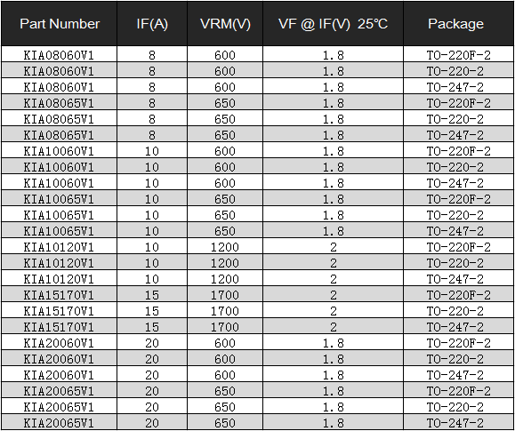 KIA半導(dǎo)體的SiC二極管利用了碳化硅出色的物理特性,其動態(tài)反向恢復(fù)特性比硅好4倍、正向?qū)妷篤F比它低15%。